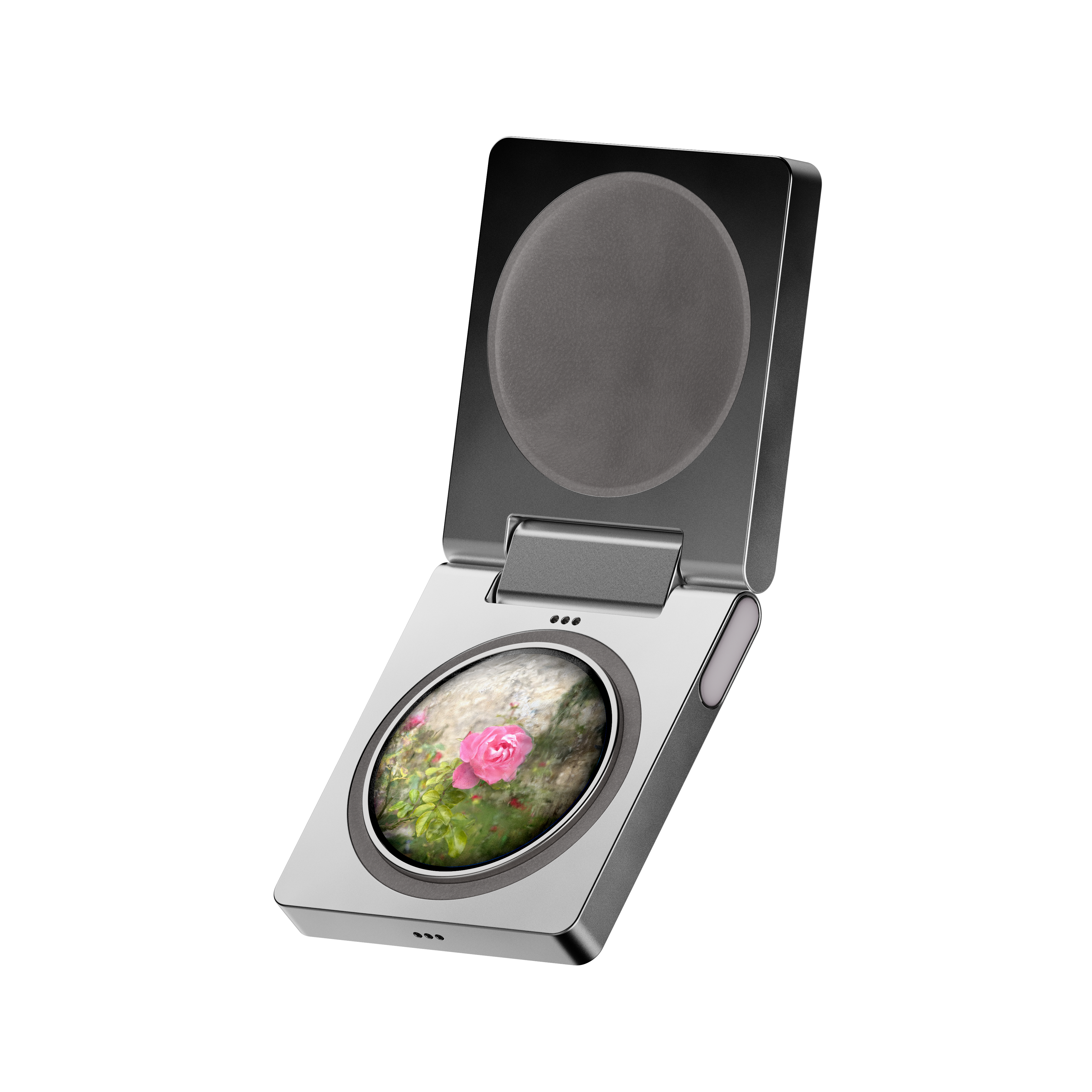 The Memory Machine, reminiscent of a classic photo locket, offers a deeply personal way to experience and relive your most precious memories through advanced spatial photography. It features a unique opening mechanism, revealing a spatial memory chip that's interchangeable, allowing access to various cherished memories.